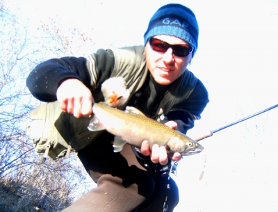 I got this little coho in a small deep pool holding the spinner in the current.